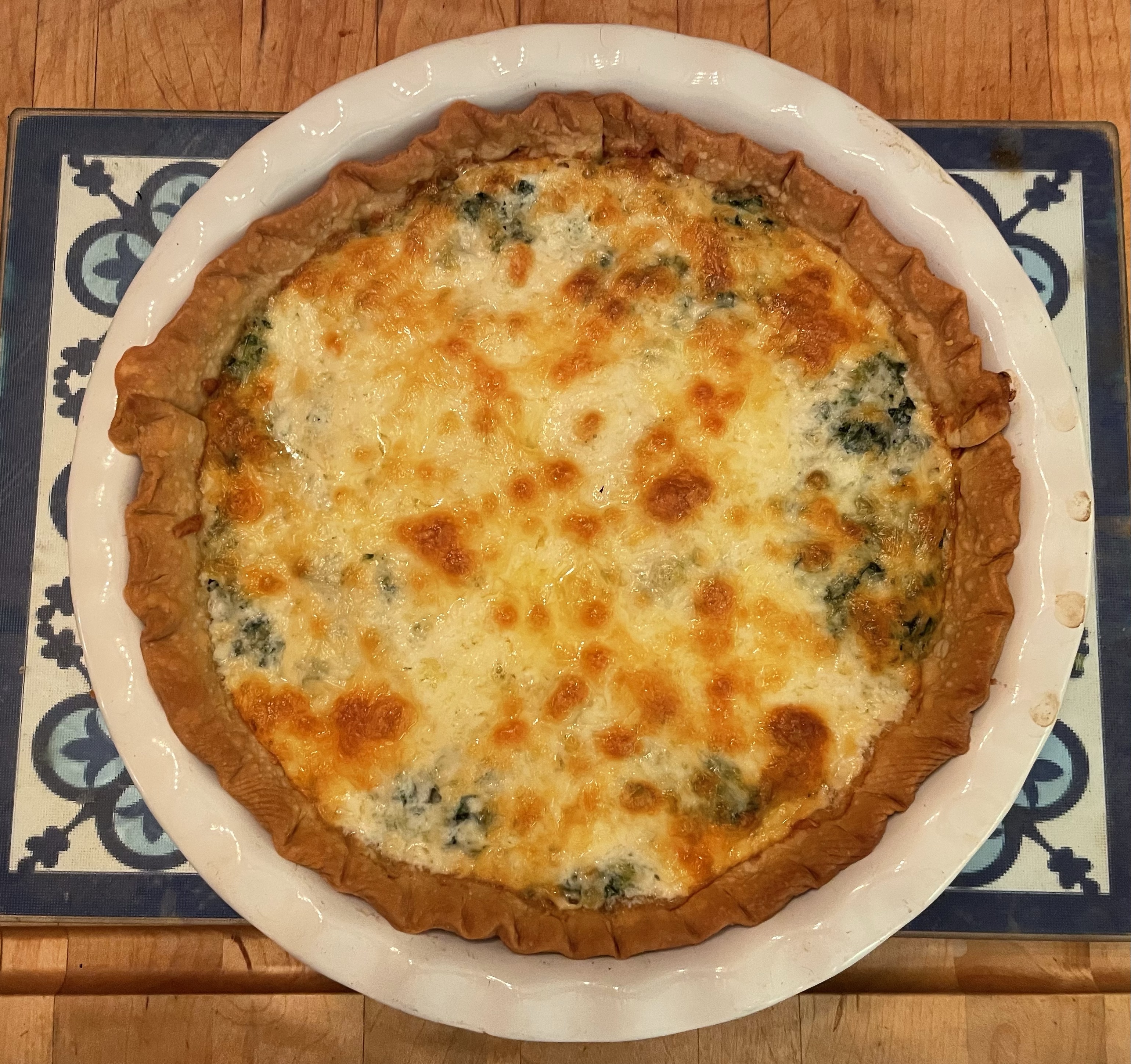 Preheat oven to 375 degrees. Microwave Spinach in glass bowl for 6 minutes with 1/4 cup water. Drain and set aside. Finely chop onion and microwave 3 minutes in ceramic bowl with 4 tbsps. butter and 1/8 tsp. salt. Shred cheese in food processor or grate using hand grater. Combine ingredients in bowl leaving 10 oz of cheese out. In blender mix heavy cream with eggs and seasoned salt. Pour mixture over ingredients and fold until all incorporated. Using a slotted spoon, evenly distribute into 2 baked pie crusts pouring any remaining liquid into both quiches. Evenly distribute remaining cheese over both quiches and dot with remaining butter. Cover exposed crust with foil and bake for 35 minutes. Serve with grapes or fruit of choice and enjoy.